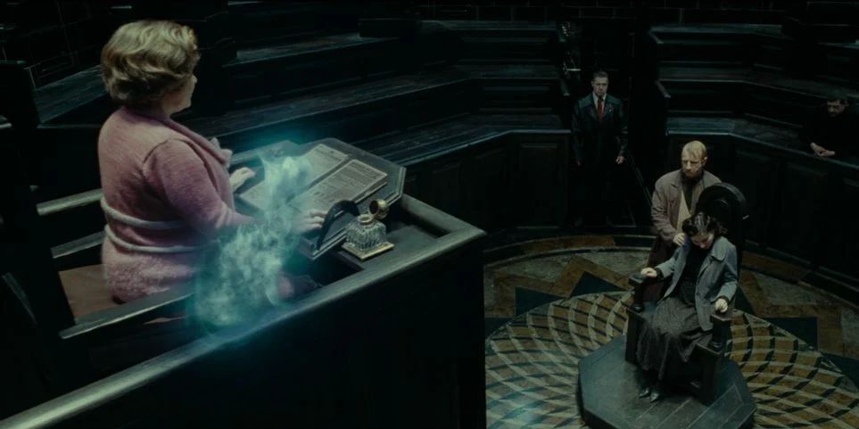 当哈利因为在麻瓜面前使用魔法而受审时,邓布利多向威森加摩指出了这一事实,因为他相信哈利说的,而且知道他被摄魂怪袭击并不是巧合或是意外。虽然当时没有人承认这一点,但乌姆里奇表示她觉得邓布利多基本上是在指责魔法部让摄魂怪针对哈利。然而,当她和家养小精灵克利切联系时,她那张虚伪的脸无意中泄露了一个事实,那就是她派摄魂怪去袭击哈利的。也许电影制作人故意遗漏了这一点,因为那时观众还不需要过多的讨厌乌姆里奇。